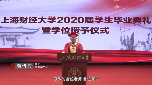 校长蒋传海勉励2020届毕业生要“认识时代、带领时代”。蒋校长提到,要从全球、国家及个体视角来看认识这个时代,了解自身正处于世界百年未有之大变局和中华民族伟大复兴战略全局同步交织、相互激荡的历史交汇期。同时,蒋校长寄语上财学子要带上母校送给毕业生们的三样行装——梦想力、学习力和坚韧力,恪守“厚德博学、经济匡时”的校训精神,成为担当时代重任的经世济民之才。