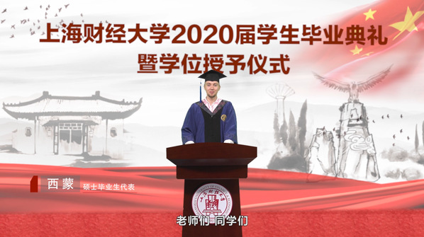 金融学院金融专业2020届硕士毕业生、波兰留学生西蒙分享了自己六年的上财生活,表示上财已经成为了自己第二个家。他希望自己能够成为促进两国往来的商贸使者,将中国博大精深的文化推广全世界发扬光大。他讲到,特别是新冠肺炎疫情发生后,学校对留学生的关心和帮助令自己非常感动,也感受到中国人民团结一致、互助互爱的精神风貌。
