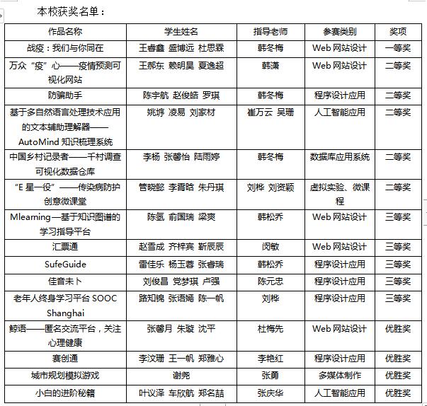 本次大赛从2019年10月开始到2020年6月为止共历时8个月,经过了校内选拔、网上报名、作品制作、专家初评、线上答辩等环节。在此过程中,组委会和广大参赛师生共同努力、积极应对,克服了新冠肺炎疫情带来的不利影响,使得赛事得以顺利进行。本次大赛共吸引来自上海的30所高校、550多件作品参赛。作品涵盖程序设计、数据库、人工智能、多媒体、网站设计和虚拟实验等多个类别,经过评审委员线上评审,最终共有304件作品荣获了三等奖以上的奖项,80个作品荣获了优胜奖。
