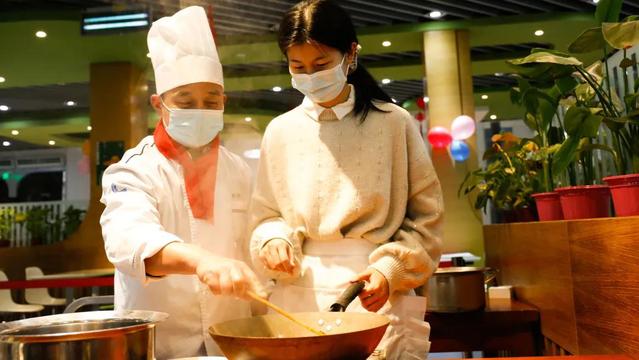 信息管理与工程学院大三学生李瑞婕和苏红宇结伴前来尝试动手做家乡菜,她们一个家在云南、一个家在湖北,平时在家没有做过饭,今天有这个机会就想小试牛刀,两人商量选择了辣子鸡这道菜,在食堂大厨的指导下,一招一式颇有风范,菜品出炉两人开心地品尝起来。