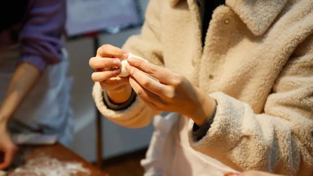 数学学院大二的尹青华同学和会计学院大四的张博萱同学,同在一桌学包汤圆,他们都是北方人,对包汤圆充满好奇,小小一颗汤圆要包的圆润并不容易,餐厅面点师阿姨手把手地教,他们学得也认真。
