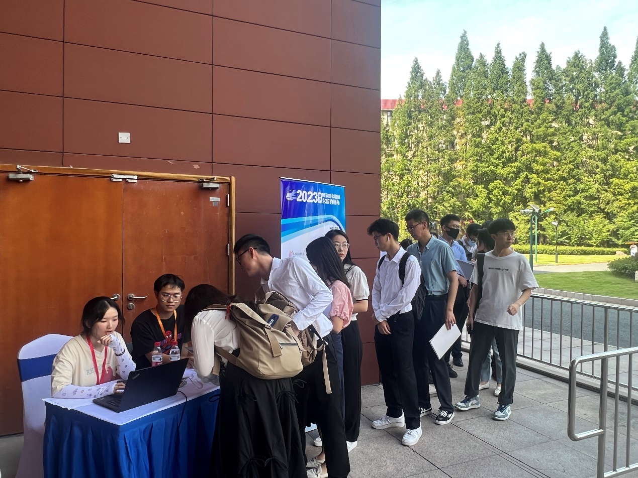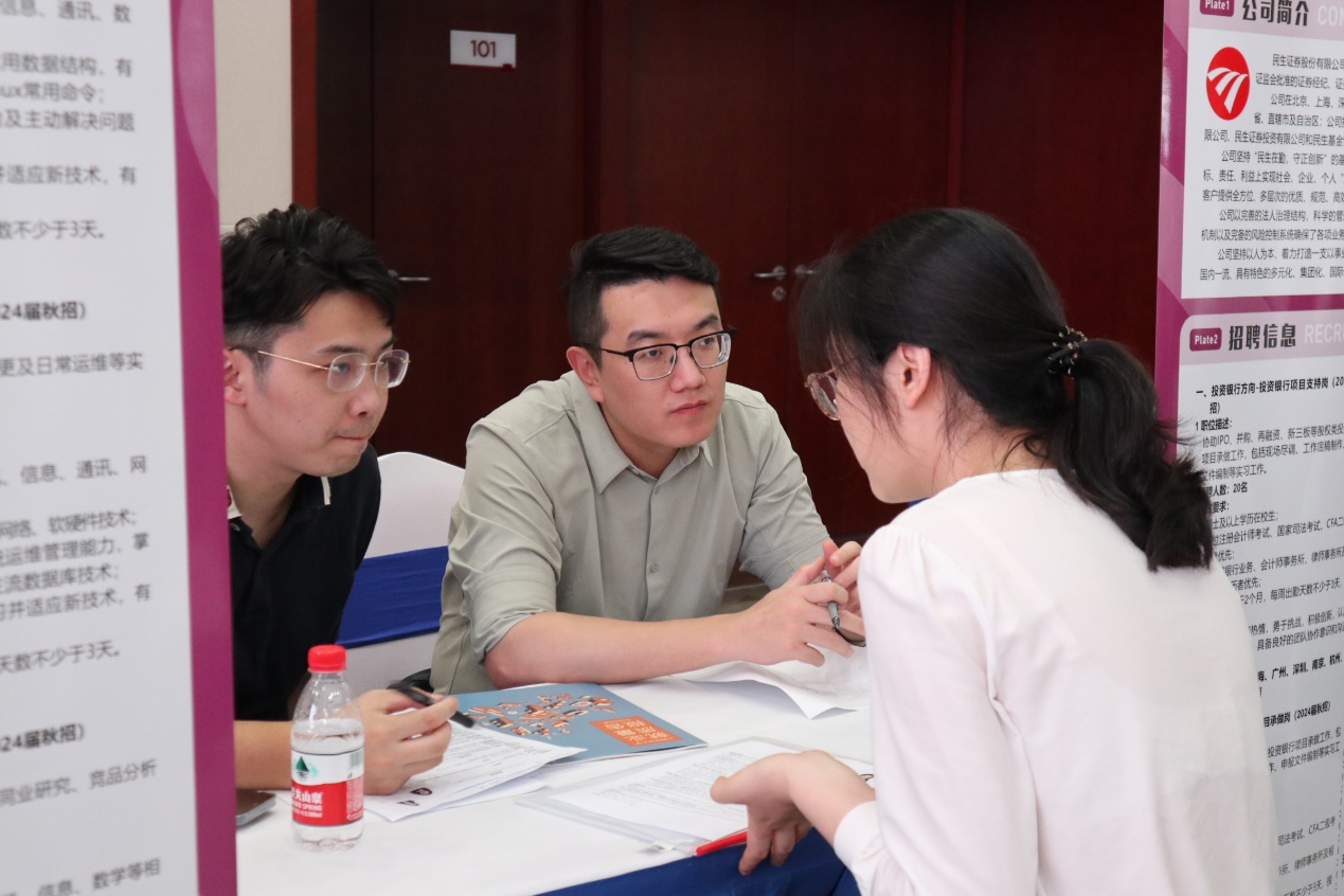 秋风送爽,活动还未开场,在科研实验大楼外候场的学生已排成长龙。13点30分,同学们有序入场,招聘会正式拉开帷幕。学子们身着正装向自己感兴趣的企业投递简历,同时就自己关心的领域与招聘负责人们展开了深入的交流。现场的金融业界人士及招聘负责人也热情回应,对工作内容、培训机制、岗位要求等具体问题进行了详尽回答,为同学们日后择业就业提供了大量信息。