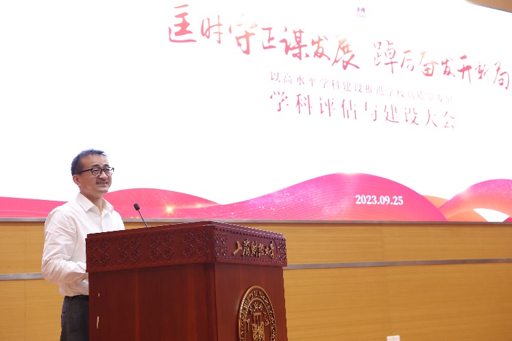 校党委书记许涛同志作动员讲话。他回顾了我校学科建设的主要举措,肯定了评估和建设所取得的成绩,强调下一步一定要直面困难和挑战,补齐短板,凝聚全校共识,推动我校一流学科建设取得长足进步。许涛书记强调,学校要站在强国建设、民族复兴的高度,以世界一流学科重点建设为引领,坚持学科发展稳中求进,前瞻性开展学科布局调研,整体提升学校的学科建设水平。许涛书记指出学校下一步学科建设的改革思路与方向:一是重点建设,整体提升。以双一流建设为抓手,全面提升学科竞争力。二是逐步优化,统筹布局。推动形成主干学科与支撑学科相得益彰、协调发展的学科体系。三是创新机制,强化支撑。完善学科发展评估机制,促进一流学科建设与一流专业建设相互支撑。