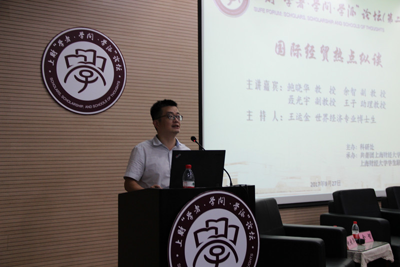9月27日晚,由上海财经大学科研处主办,共青团上海财经大学委员会、学生联合会共同承办的上财“学者·学问·学派”论坛第二期在国际工商管理学院如期举行。本期论坛邀请到来自国际工商学院的鲍晓华、余智、聂光宇、王子四位老师担任主讲嘉宾,对当前国际经贸几个热点问题展开论述。论坛由国际工商管理学院博士生王运金主持。