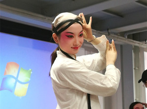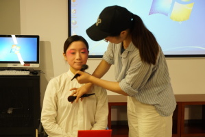 课上谷好好老师还带来了昆剧团的演员现场展示,她们分别是唱闺门旦的张颋(昆四班)和姚徐依(昆五班)以及身兼化妆、武旦的林月媛。谷老师一边讲解,演员们一边展示,姚徐依为大家清唱了一段昆曲,全场屏息聆听,唱完后获得同学们的热烈掌声。接着林月媛为姚徐依化妆,底妆、油彩、胭脂,“勒头”。此外,现场还邀请一位学生上去体验妆容,来自信息管理与工程学院的李慧娴进行了尝试。让同学们身临其境地感知昆曲是如此“讲究”的一个剧种:至少要2个小时才能化完基础的妆,内穿的衣服不管多热都要穿长袖,不能露出肉,不能让汗沾到戏服上,穿上戏服后不能入座以防戏服有褶皱,彩裤不能在化妆前穿,以防被颜料弄脏,谷老师强调这些细节也是文化传承的内容,容不得半点马虎。近2个半小时的课程,同学们全神贯注的听讲,现场也来了不少男同学,大家都兴致很高,在谷好好老师讲授的过程中积极提问,并且在课程结束后依然围绕着谷老师和两位美丽的剧团演员,进一步交流。还有同学将事先准备好的昆剧节目单拿出来请谷老师签名,俨然就是“老戏迷”。