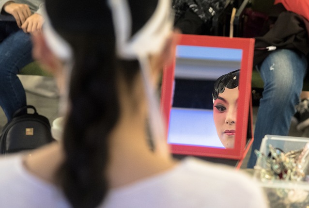 信息管理与工程学院李慧娴:作为第一个体验者开始有点怕怕,但是看到花旦小姐姐那么好看我也就一咬牙上了。刚开始香香的还挺好闻,但是接下来一层又一层的底妆、粉和胭脂就让我有点透不过气了,感觉自己的脸俨然成了一块画布。还好谷老师之前就有过科普,这样一层又一层细密的打磨就是为了给观众呈现最好的角色。最后还是被完妆的样子小小惊呆了一下,人蝶不分,梦觉难辨,昆曲如梦如幻的感觉就是从妆容这一步开始的。