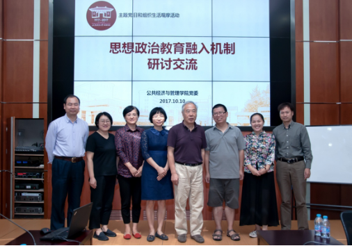 10月10日,公共经济与管理学院党委在凤凰楼302举办了主题为“思想政治教育融入机制”研讨交流活动。上海市社科联原党组副书记桑玉成教授担任活动的点评嘉宾,国际工商管理学院党总支组织员郑纯选老师、经济学院党委书记王昉老师、马克思主义学院直属党总支书记范宝舟老师到会观摩指导,公管学院40多名教师党员参加了活动。活动由学院党委纪检委员高晓晖老师主持。