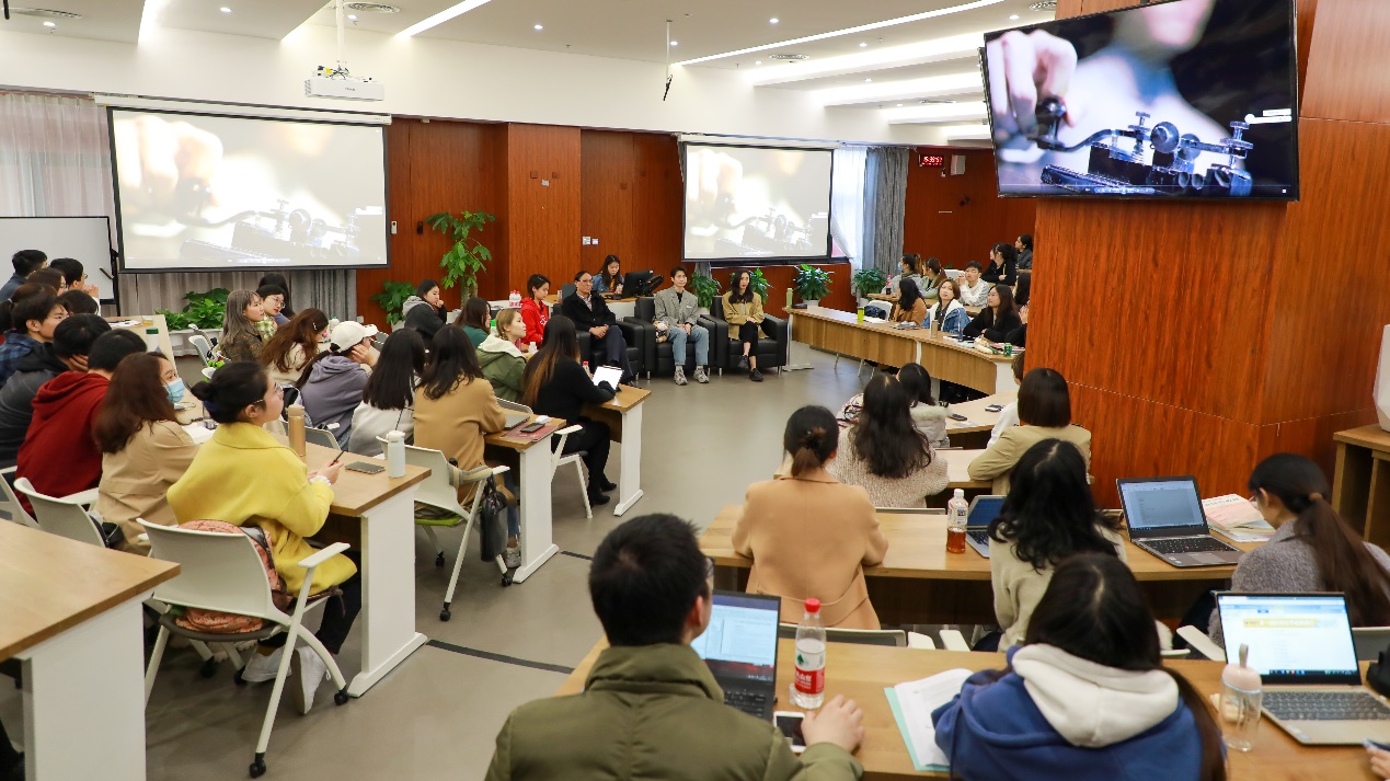 3月23日下午,作为中共上海市教育卫生工作党委、共青团上海市委员会、中共上海财经大学委员会联合主办的“潮涌东方,光耀中华——迎接建党一百周年,红色经典进校园”系列活动之一,我校邀请了舞剧《永不消逝的电波》主创团队在科研实验大楼B115开设了一场红色舞剧《永不消逝的电波》导赏主题沙龙。本次沙龙邀请到了上海歌舞团团长、国家一级导演、《电波》制作人兼艺术总监陈飞华,上海歌舞团荣典首席演员、国家一级演员王佳俊,上海歌舞团荣典首席演员、国家一级演员、上海舞蹈家协会副主席朱洁静三位重量级嘉宾。嘉宾们与同学们近距离接触,生动地讲述了作品的创作背景、排练过程以及剧目亮点,为同学们带来了一场异彩纷呈的艺术主题沙龙。