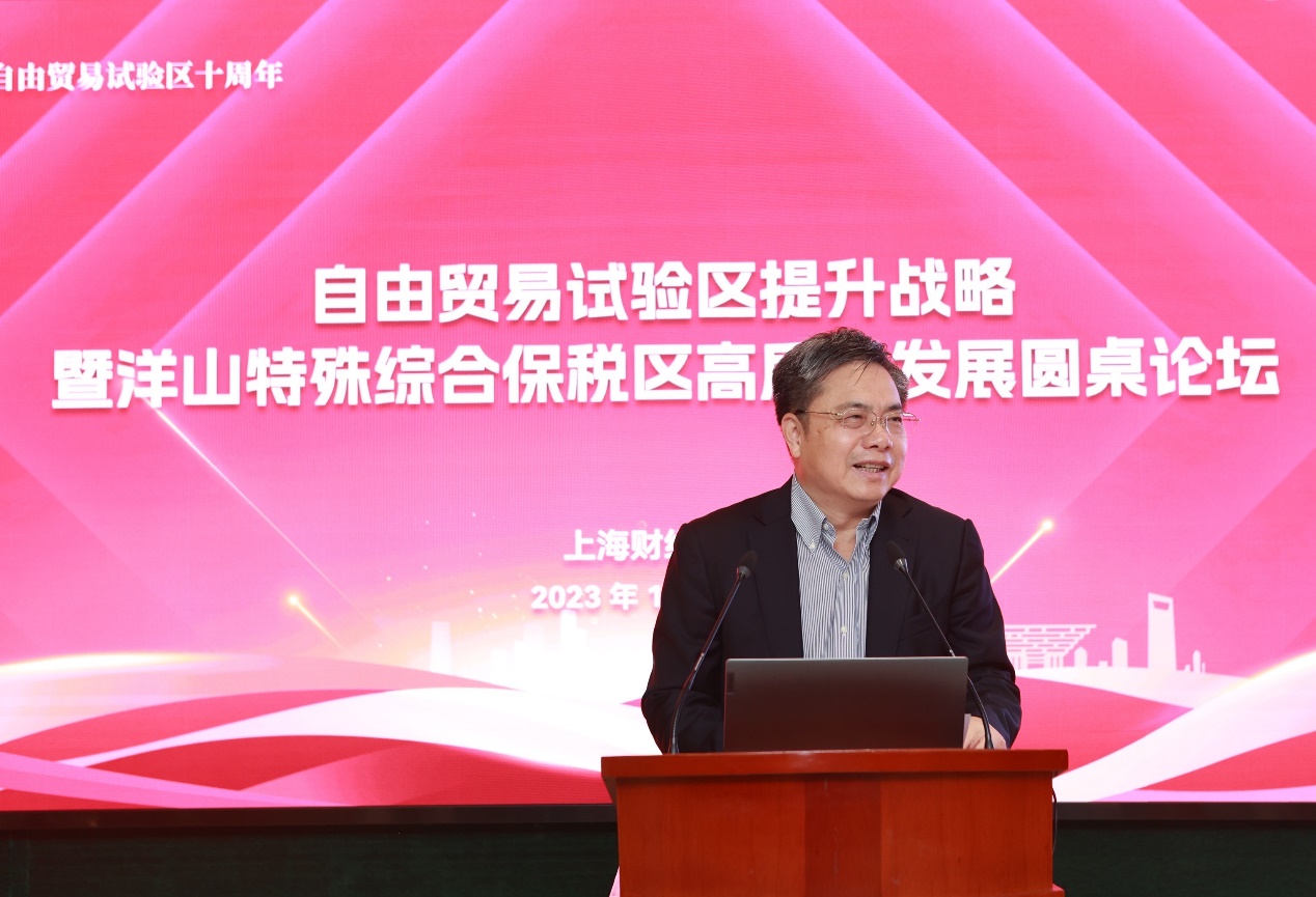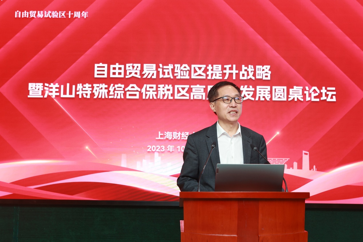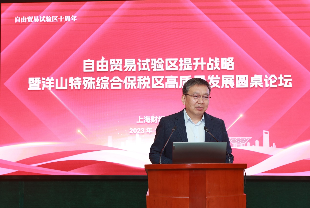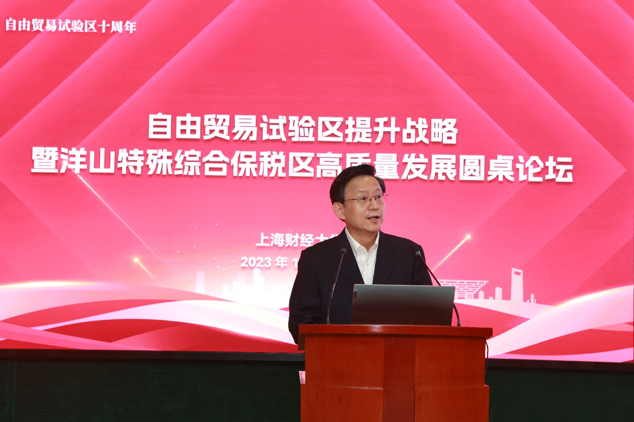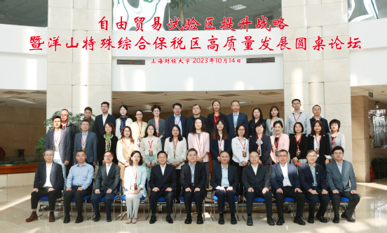 10月14日,自由贸易试验区提升战略暨洋山特殊综合保税区高质量发展圆桌论坛在上海财经大学召开,本次论坛由上海自由贸易试验区临港新片区管理委员会指导,上海财经大学中国式现代化研究院、中国自由贸易试验区协同创新中心、上海财经大学自由贸易区研究院、上海财经大学滴水湖智库联合主办。