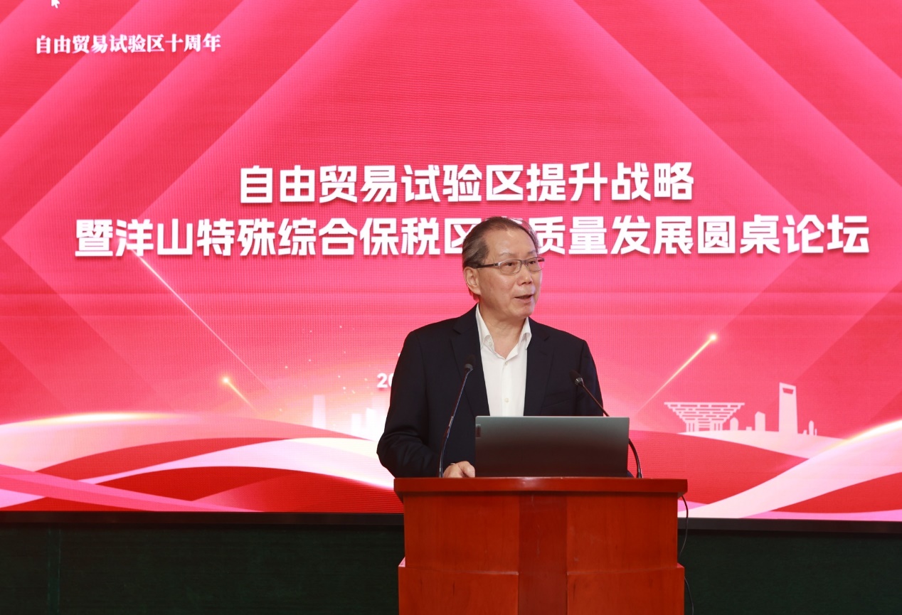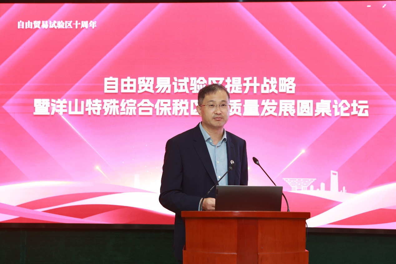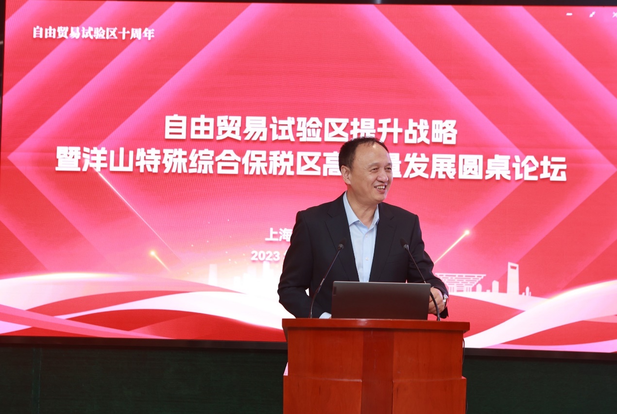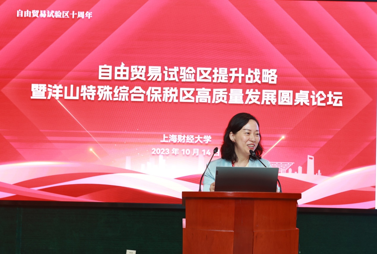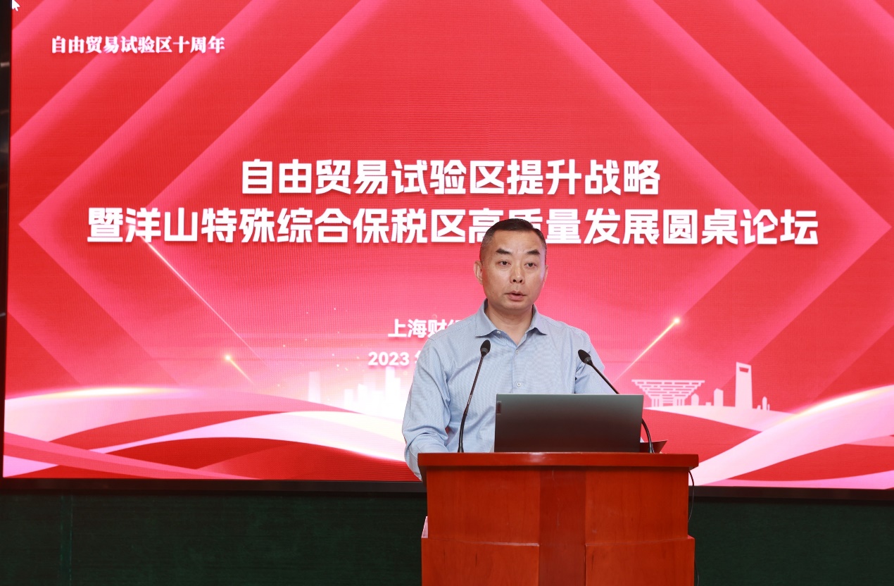 10月14日,自由贸易试验区提升战略暨洋山特殊综合保税区高质量发展圆桌论坛在上海财经大学召开,本次论坛由上海自由贸易试验区临港新片区管理委员会指导,上海财经大学中国式现代化研究院、中国自由贸易试验区协同创新中心、上海财经大学自由贸易区研究院、上海财经大学滴水湖智库联合主办。