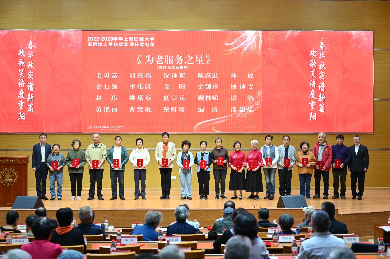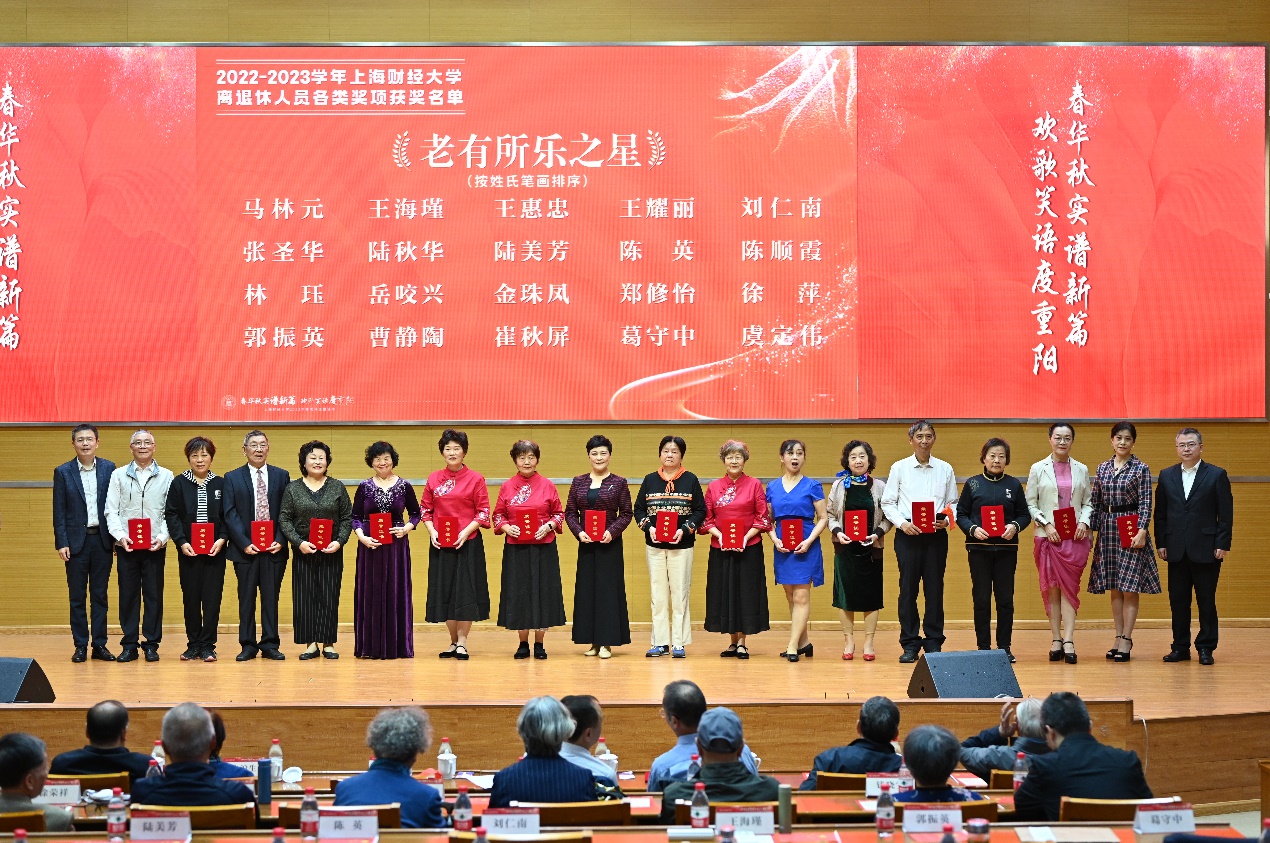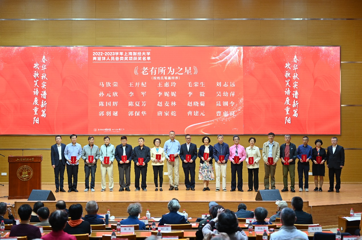 离退休党委书记牛文光宣读2022-2023学年上海财经大学离退休人员表彰决定。校党委组织部部长周国良、宣传部部长曹东勃为“老有所为”之星、“老有所乐”之星、“为老服务”之星和“老有所学”之星颁奖。校长助理刘莉亚为“阳光老人”之星颁奖。