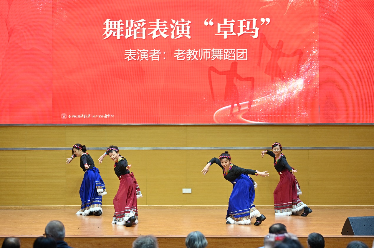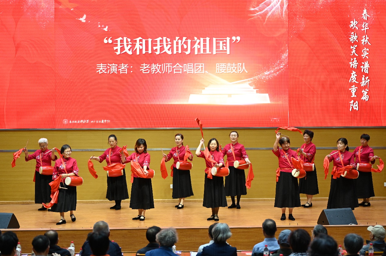 随着欢快的节奏,老同志纷纷上台献艺,老教师合唱团和腰鼓队《我和我的祖国》,时装表演《上财赋》,舞蹈《卓玛》,京胡演奏《琴缘》精彩呈现,节目内容荟萃了丰富的传统文化元素,演绎出百年上财历史画卷。老同志们精神饱满、神采飞扬,歌颂新时代,歌颂新生活,现场气氛温馨而热烈。