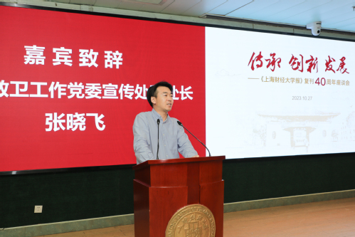 张晓飞副处长代表市教卫工作党委向《上海财经大学报》复刊40周年表示祝贺,向各位采编人员、专家学者的辛苦付出表示衷心的感谢。他表示,要认真学习领会全国宣传思想文化工作会议精神,贯彻落实上海宣传思想工作会议的决策部署,积极构建传承文化、传播文化、以文化人的思想高地,为推动教育高质量发展提供坚强思想保证、强大精神力量、有利文化条件。办好高校的校报工作,一是把牢政治方向,更好发挥舆论引导的阵地作用;二是把握育人宗旨,更好发挥思政教育的平台作用;三是把准文化根脉,更好发挥传承创新的载体作用。