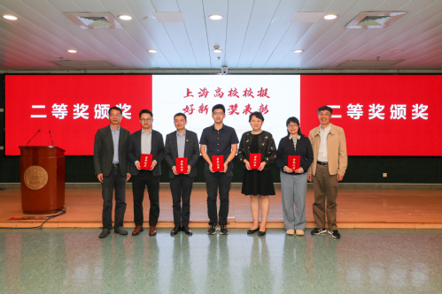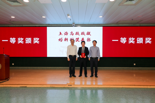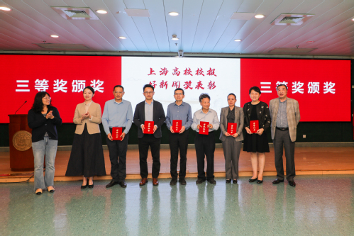致辞环节结束后,大会对获得2020-2021年度上海高校校报好新闻奖的上财师生作者进行了表彰。华东师范大学党委宣传部副部长陈颖、华东理工大学党委宣传部副部长房树芬、上海财经大学校报第一任编辑部主任崔燮钧颁发三等奖;上海财经大学原党委宣传部部长刘志远、《解放日报》王仁维老师颁发二等奖;许涛书记、张晓飞副处长颁发一等奖。