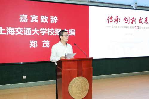 上海交通大学校报主编郑茂作为兄弟高校校报代表致辞。他从权威性、不可修改和删除、学校发展的历史资料、时光记忆的珍藏、情感交流的空间等五个方面分享了对于新时代校报独特价值的体会与思考。