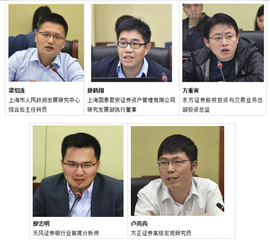 在互动交流环节,与会专家对课题组的分析进行了精彩点评,提出了很多真知灼见。比如,上海市人民政府发展研究中心综合处主任科员梁绍连从GDP、工业、外贸等具体数据认为报告的分析及预测很“靠谱”;上海国泰君安证券资产管理有限公司研究发展部执行董事薛鹤翔对货币供应、房地产市场等方面发表了自己的观点,认为要特别重视“一带一路”沿线的经济发展,短期库存周期补库存接近后期,更中长期的设备投资周期还没有开启,需要一定的时间;东方证券股权投资与交易业务总部投资总监方重寅认为随着信贷宽松、工业企业利润的回升,最终体现的就是平均收入提升;天风证券银行业首席分析师廖志明通过比对银行数据,非常认同报告中关于人民币汇率走势的分析;方正证券高级宏观研究员卢亮亮认为报告对包括经济数据、金融数据的分项解读非常重要,同时也提出应该对未来,或者对于中短期、中长期要有自己的看法和建议。课题组朱梅副研究员、王玉琴助教授、李倩助教授、巫厚玮助教授、张同斌助教授、梁润助理研究员、宁磊博士后等就相关问题做了回答。