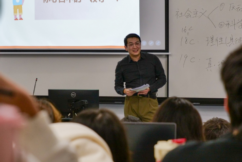 随后,徐飞副校长走上讲台,在张鋆老师的前序讲解和同学们对欧文、傅里叶、圣西门等空想社会主义者的生平及其成败的讨论基础上,以马克思主义的科学性、人民性、实践性、开放性为线索,对《社会主义从空想到科学的发展》做了精彩剖析,进一步说明了中国化时代化的马克思主义“为什么能”、“为什么好”、“为什么行”的问题,带领同学们走入一个全新的学习维度。在与同学的积极互动中,徐飞副校长也分享了自己对于《国际歌》的切身体会;并向同学们传达了“有之以为利,无之以为用”的深刻洞见,引导同学们大学期间应开展更多、更深入的经典阅读,提升自己的阅读品位和道德境界。他叮嘱同学们,“经典阅读”是一种有效的深阅读。经典,代表了所在时代的最高智慧,是经受住岁月考验而历久弥坚的人类精华,值得用心去“深阅读”。但说到读经典,很多人很可能因其太过博大宏阔或高深艰涩而望而却步。阅读大部分经典的确并不轻松,当读者的学识积累和思维训练还没有达到应有程度的时候,要读懂进而领会先贤圣哲的闳博睿思和学理旨趣,注定是个艰辛和挑战的过程。然而,正是因为经典本身的博大精深和阅读过程的丰富性和挑战性,能够带给读者最大可能的收获与享受。最后,他鼓励同学们要有志气和勇气,通过“读经典、悟原理”的方式,真学真懂真信真用马克思主义。