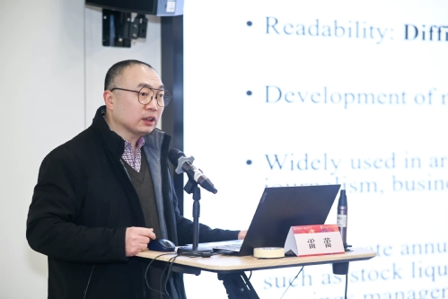 雷蕾教授做了题为“Proposing AlphaReadability: A tool measuring text readability”的主题报告,主要针对企业年报文本的可读性差异现象进行分析,提出字母可读性研究方法,从词汇、句法和语义等层面探究文本可读性与股票流动性、经营策略、公司风险回报和盈余管理等因素之间的关系。研究发现在过去的二十年里,年度报告在单词的使用、句法结构和语义方面变得可读性较差,业绩较低的公司战略性地利用其披露的可读性来混淆负面结果,提出平实易懂的企业年报写作风格议题。