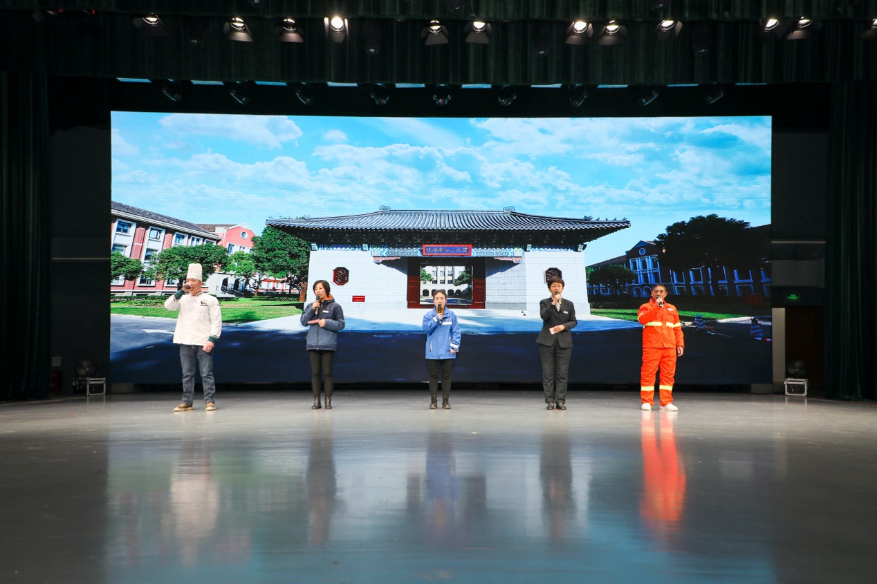 随后,后勤中心餐饮服务部第三食堂经理董振峰、上海生乐物业管理有限公司学生公寓宿舍管理员黄霞、菜鸟驿站店长常艳、上海东方大学城物业管理有限公司图书馆多媒体吴娇、后勤中心物业部环卫班组长冯国强五位优秀后勤人代表分别为大家讲述《2023年我工作中最有成就感的一件事》。他们从食堂餐饮、学生宿舍、快递运送、会场多媒体、校园环境等不同角度阐述了后勤工作的点点滴滴,上财食堂的烟火气、学生热情的拥抱、一件件带着温度的快递、整洁的校园环境背后垃圾分类工作的日常艰辛……平凡的小事却书写着上财后勤人心里的热忱善良和浓浓暖意。阳和不择地,海角亦逢春。后勤人不忘育人初心、牢记服务使命,以校为根,以师生为本,在各自平凡的岗位上长期坚守、辛勤耕耘,为构建一流的教书育人环境贡献自己的力量。