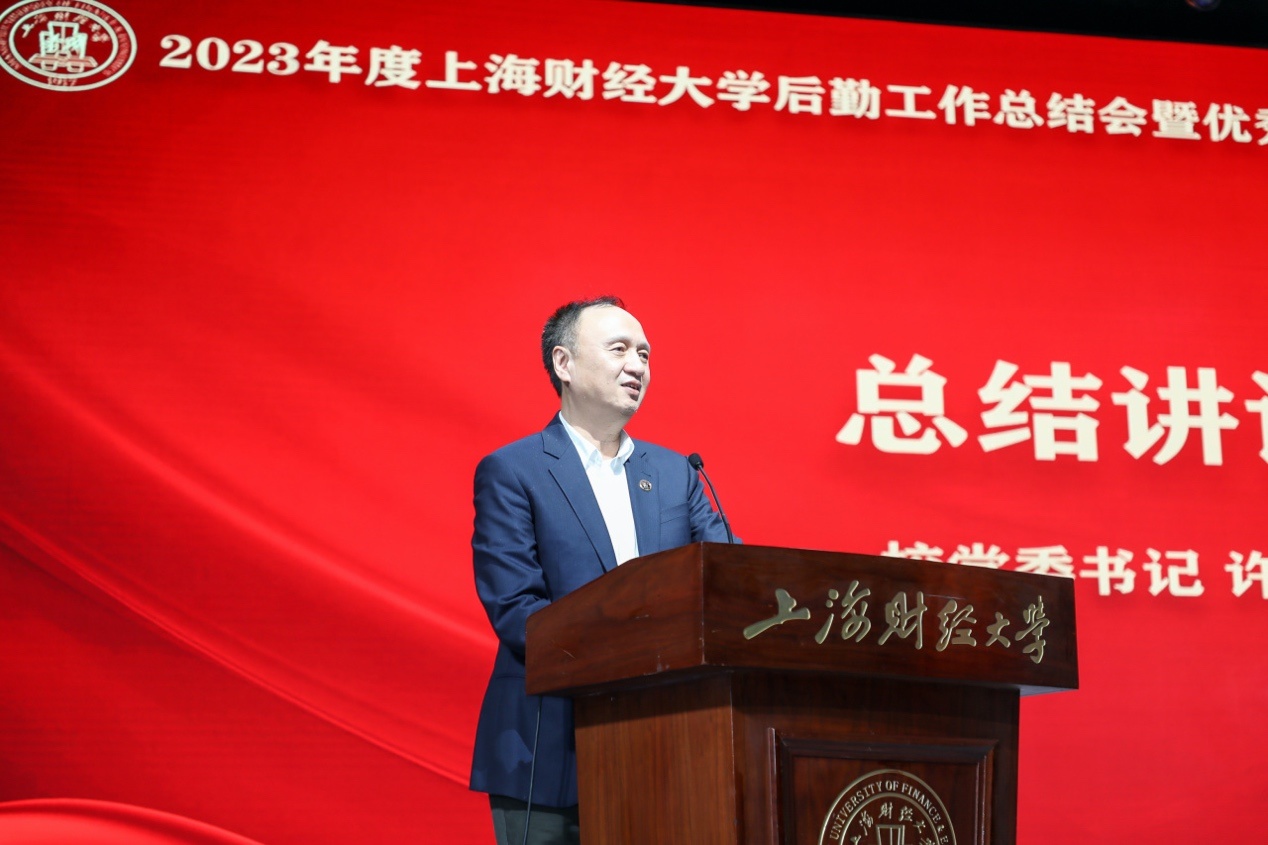 颁奖仪式结束后,许涛书记做总结讲话。许涛书记代表学校党委对所有后勤员工为上财校园安全运行、平稳发展所作出的努力表示感谢。对后勤工作始终主动与学校党政工作同向而行,积极落实党的要求和教育方针,并积极开拓创新予以了充分肯定。他表示,后勤员工在2023年始终坚守一线,校园的干净、整洁、安全、美丽都反映了后勤人的辛勤和汗水。大学的主体是学生,“立德树人”是大学教育的核心,后勤工作充分体现了学校的教育理念。后勤部门积极开展劳动教育,在学校食堂、宿舍、楼宇等每一个角落都践行着服务育人的使命,每个后勤人都在为学校发光发热。许涛书记为所有后勤员工送上真挚祝福,期待2024年所有后勤人与学校一起踏实进取、开拓创新,共创学校事业新辉煌。