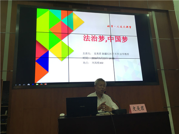5月22日下午,新疆石河子大学史美君教授应邀做客我校“科学·人文大讲堂”,为我校学生带来“法治梦,中国梦”专题讲座。讲座在凤凰楼302室举行,吸引了全校130余名师生前来聆听。