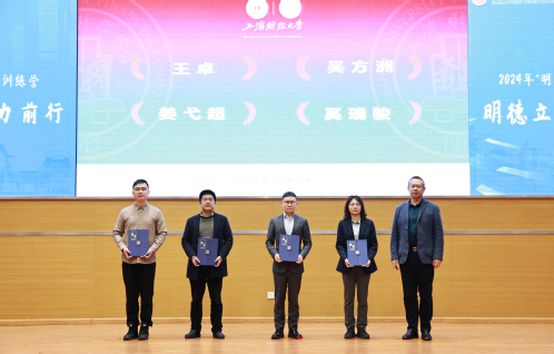 3月8日中午,上海财经大学2024年“明德”青年领导力训练营开营仪式在创业中心一楼报告厅举行。上海道得投资管理合伙企业有限公司创始合伙人、上海财经大学校董、“明德”青年领导力项目捐赠人武飞,上海财经大学党委常委、常务副校长徐飞,上海财经大学党委常委、宣传部部长曹东勃,相关职能部门领导、青年导师、全体2024年“明德”学员共同出席了本次开营仪式。