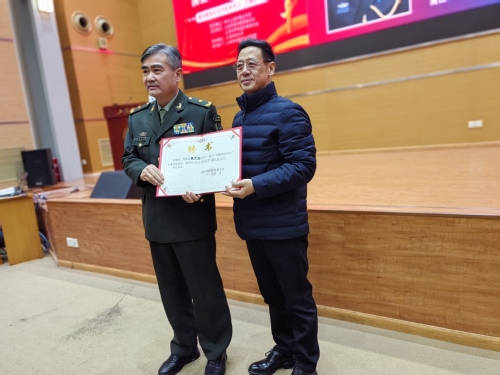 活动开始,市国防教育基金会理事长王锦飞为黄将军颁发“国防教育”授课聘书。曹东勃部长代表学校简要介绍了学校国防教育工作情况。