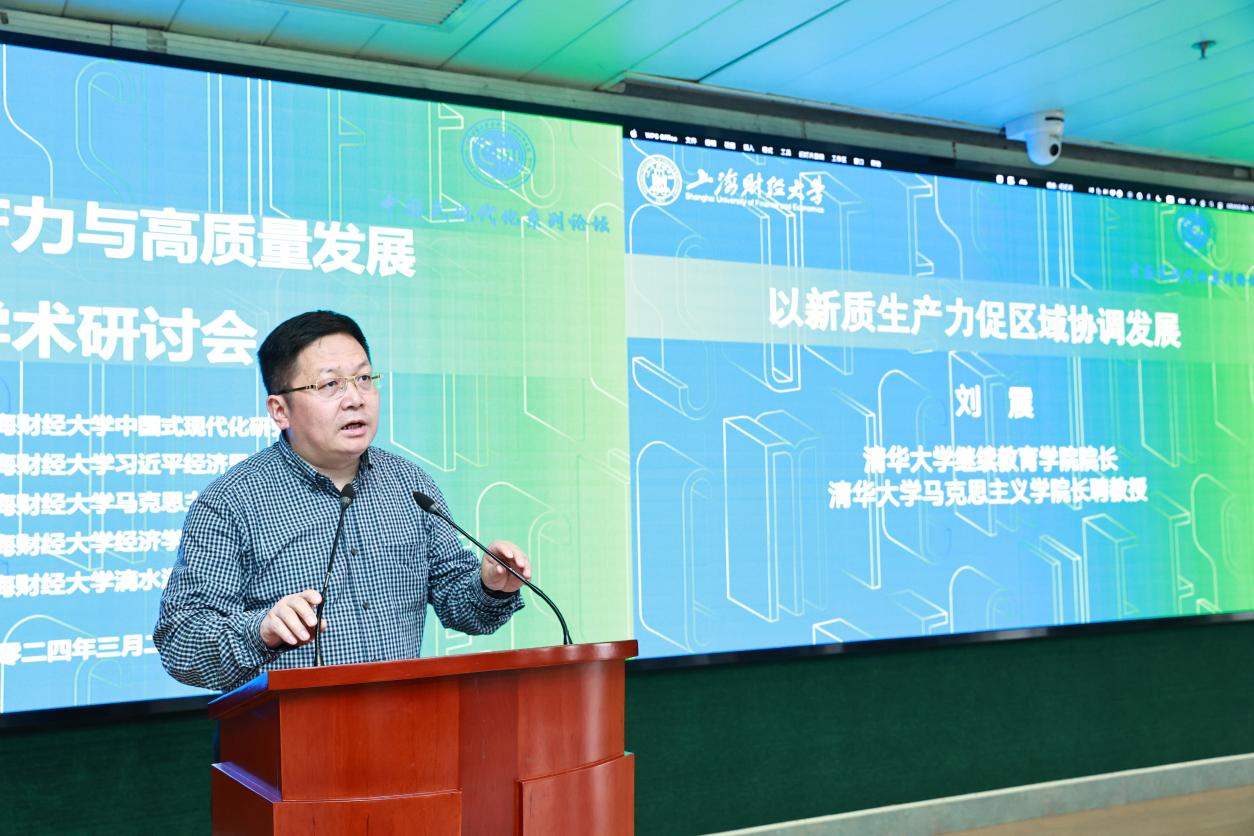 清华大学继续教育学院院长、清华大学马克思主义学院刘震教授以“以新质生产力促区域协调发展”为题发言。刘震教授指出,习近平总书记将新质生产力提到一个重要的位置,指出发展新质生产力是推动高质量发展和实现区域协调发展的重要抓手和着力点。这就要求,第一,深化改革,打通“堵点”,推进全国统一大市场建设;第二,结合不同地区情况,因地制宜进行谋篇布局;第三,发挥市场资源配置决定作用的同时,政府在规划发展新质生产力方面下大功夫。