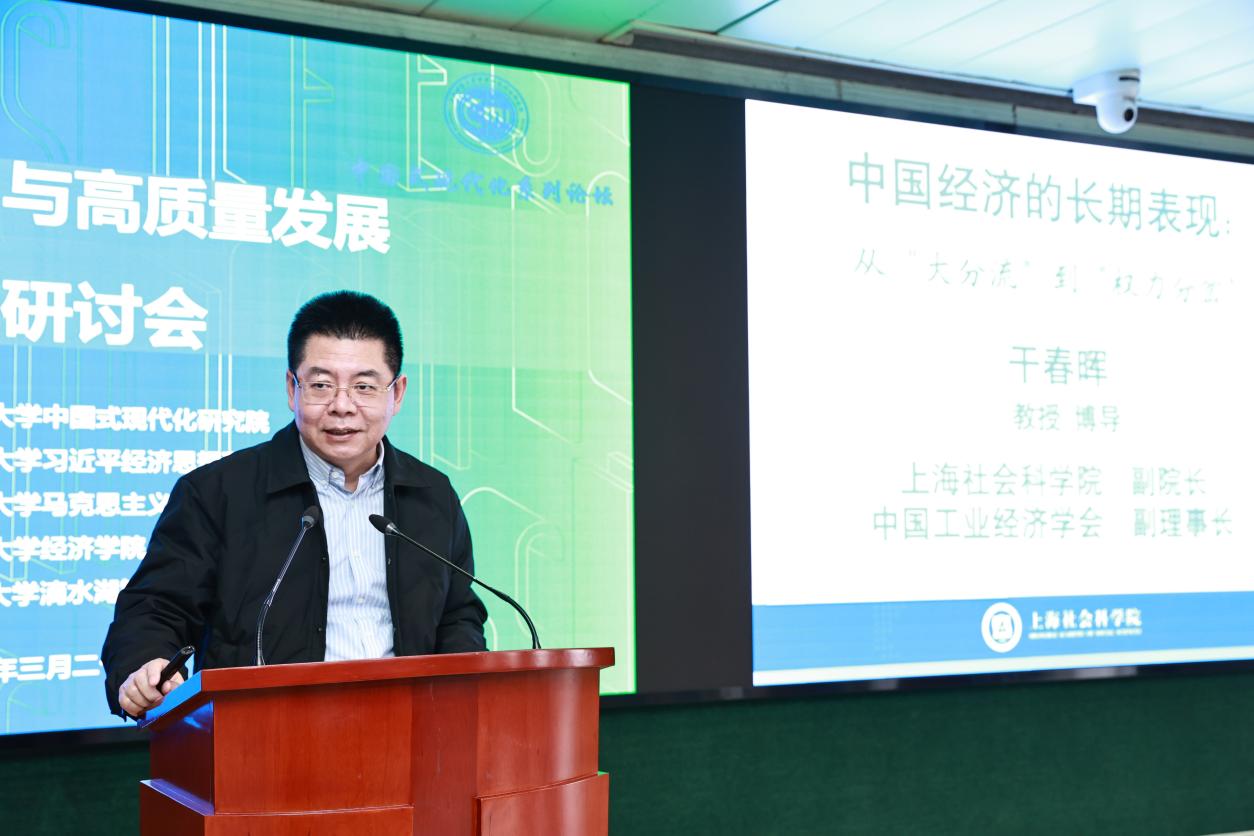 上海社会科学院副院长、应用经济研究所所长干春晖教授以“中国经济的长期表现:从‘大分流’到‘权力分岔’” 为题发言。干春晖教授指出,从工业革命以来的历史来看,世界的发展呈“波浪式”分层展开,产业革命由发达国家向次发达国家逐渐推进。2001年中国加入WTO后加快了走向世界的步伐,2017年以后中国综合国力的发展带来亚洲格局的质变,并逐渐成为世界主要贸易中心。未来,面对美国、欧洲等创新中心的挑战,要求我们加快形成新质生产力以进行竞争与追赶。