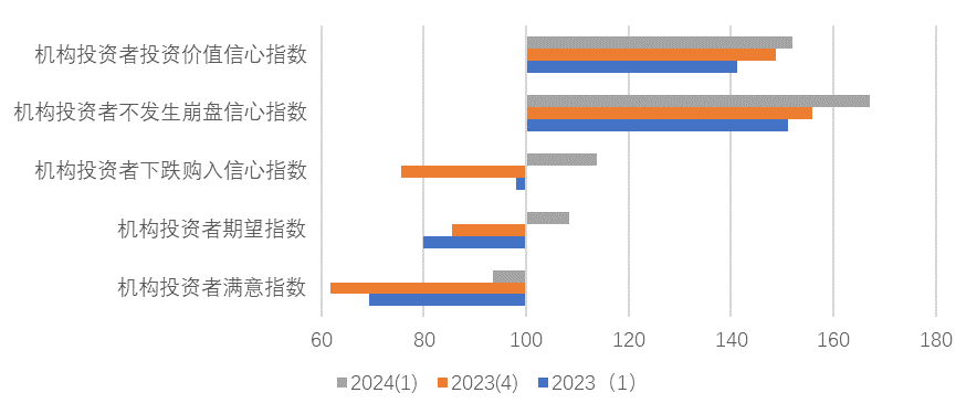 本季度上海市机构投资者信心指数大幅上升主要来自两方面的影响:一是今年两会政府工作报告提出,大力推进现代化产业体系建设,加快发展新质生产力。新质生产力热点随即快速催化,提升了多个具有科技属性的板块收益提升,A股市场震荡上行,机构投资者满意度大幅上升。另一方面,支持国内资本市场发展的相关政策密集出台,政策“组合拳”释放出提升监管力度、推动资本市场高质量发展的政策信号,机构投资者对于A股市场的看法向好。在此背景下,一季度机构投资者的投资信心增强。