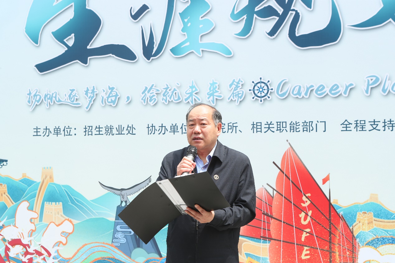 上午11点45分,校企嘉宾移步绿叶步行街,出席“扬帆逐梦海,绘就未来篇”第十六届生涯规划月启动仪式暨公开咨询日活动。校党委副书记朱鸣雄首先致辞,他表示生涯规划是学生成长成才的重要途径,生涯教育也是我校教育工作的重要环节,朱书记勉励莘莘学子培养自身的生涯意识、拓宽自身的职业视野、明确自身的发展方向,并为今后的人生添砖加瓦,为未来的成长积蓄力量。