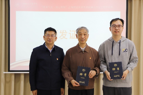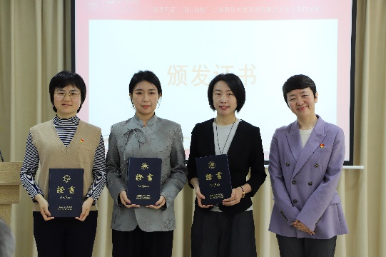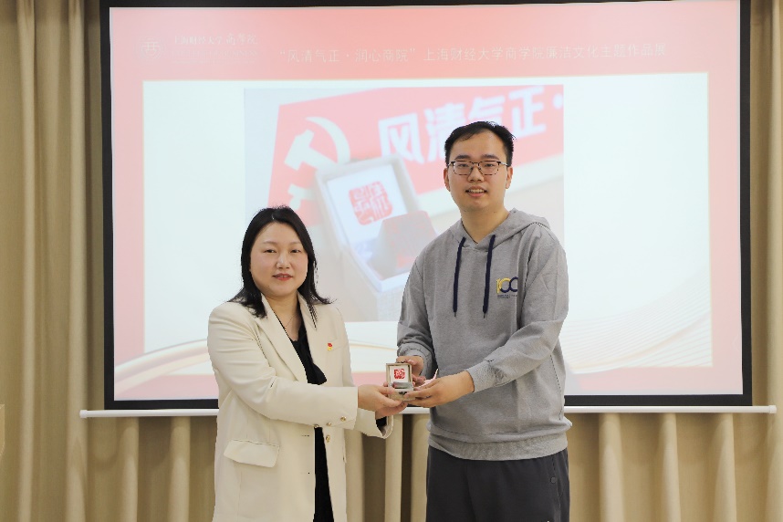 最后,为了感谢师生对学院主题作品展的支持,上海财经大学党委副书记、纪委书记何鹏程为戴国强老师、张文衡同学颁发收录证书,上海财经大学商学院正处级专职组织员薛丽萍为金雁南老师、陆丽娜老师、胡琨丽老师颁发收录证书。