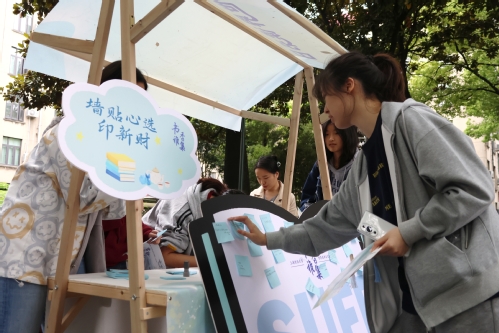 用一册旧书换得一卷新知。研究生会用露营车改造为创意流动书摊,倡导书卷互易,呼吁捐书赠书,书香传递情谊长。流动起来的图书激活了阅读的生命力,让知识在校园中流动。墙贴心选印新财,同学们手握五彩便利贴,凝神思索,写下的一笔一划,都是对阅读时光的深情铭记,对书香生活的诚挚致敬。