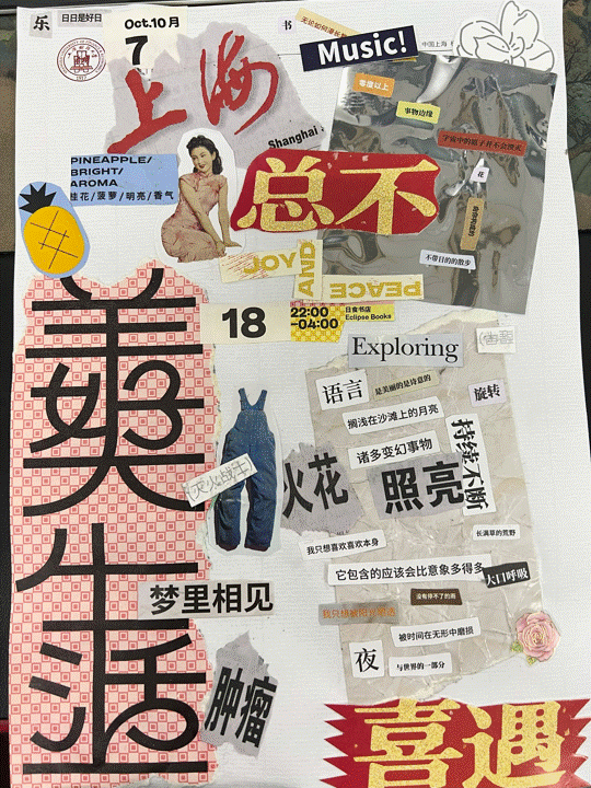 第二场则是别开生面的“SUFE 博物艺趣:在春日里,读图写诗”拼贴诗体验工坊,活动由上海控江中学艺术教师、市级创新实验室文创中心负责人王独伊老师主讲。策展人首先为同学们将解构展览中月份牌的画面元素作为引入,随后王老师通过对多幅经典现代主义艺术作品的赏析,科普现代艺术的要素。同学们在两位老师的解读中,一起走进图像式的海派风景,也进入了美的深层次领域,为之后的诗作创作注入了更多的灵感。2021级会计学院的邓同学表示,这是一场生动有趣的活动,轻松又解压,对月份牌文化也有了更多的了解;2022级公共经济与管理学院的周同学说:“拼贴诗的创作不仅仅是对语言的重组,更是对情感的重新诠释。在两位老师的引导下,我可以把不同的情感、记忆和想法融合在一起,形成全新的表达。这个过程就像寻找和组合一颗颗小小的宝石,最终形成一件完整和精美的艺术品。”