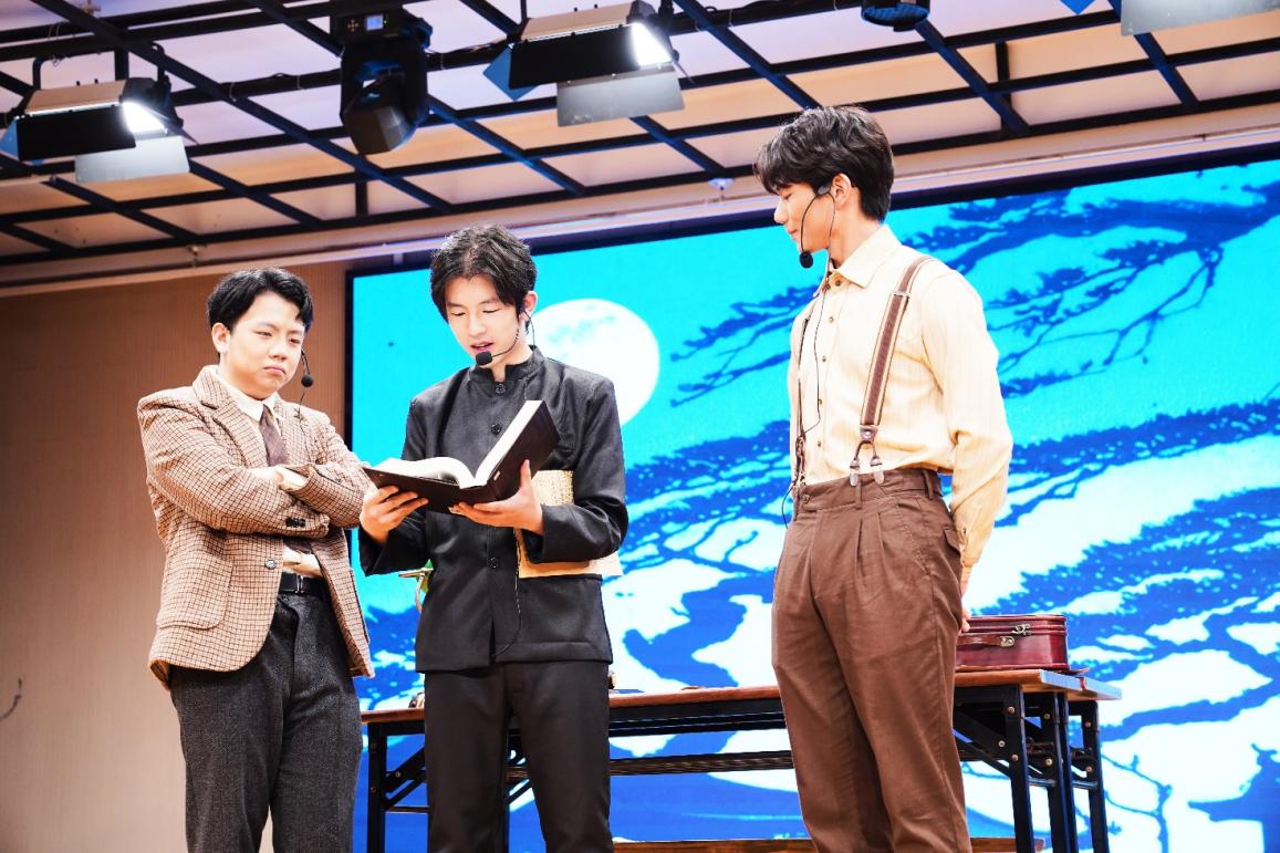 法治情景剧《最后的亲历者》作为巡演的首站演出,吸引了众多师生和法律界人士的关注。话剧以向哲濬、高文彬、倪征燠、周芳、向家女佣为原型,分别打造出高明德、向思翰、倪致博、周梓兰、陈姐等立体饱满的人物形象。通过小话剧的形式,讲述了“东京审判”中国检察官秘书、翻译高明德的故事,以及他在东吴大学法学院的学习经历和对法治事业的执着追求。话剧中的角色者均由上海财经大学法学院在校本科生扮演,通过沉浸式戏剧的角色扮演,将红色文化、法治宣传和思想政治教育有机结合。