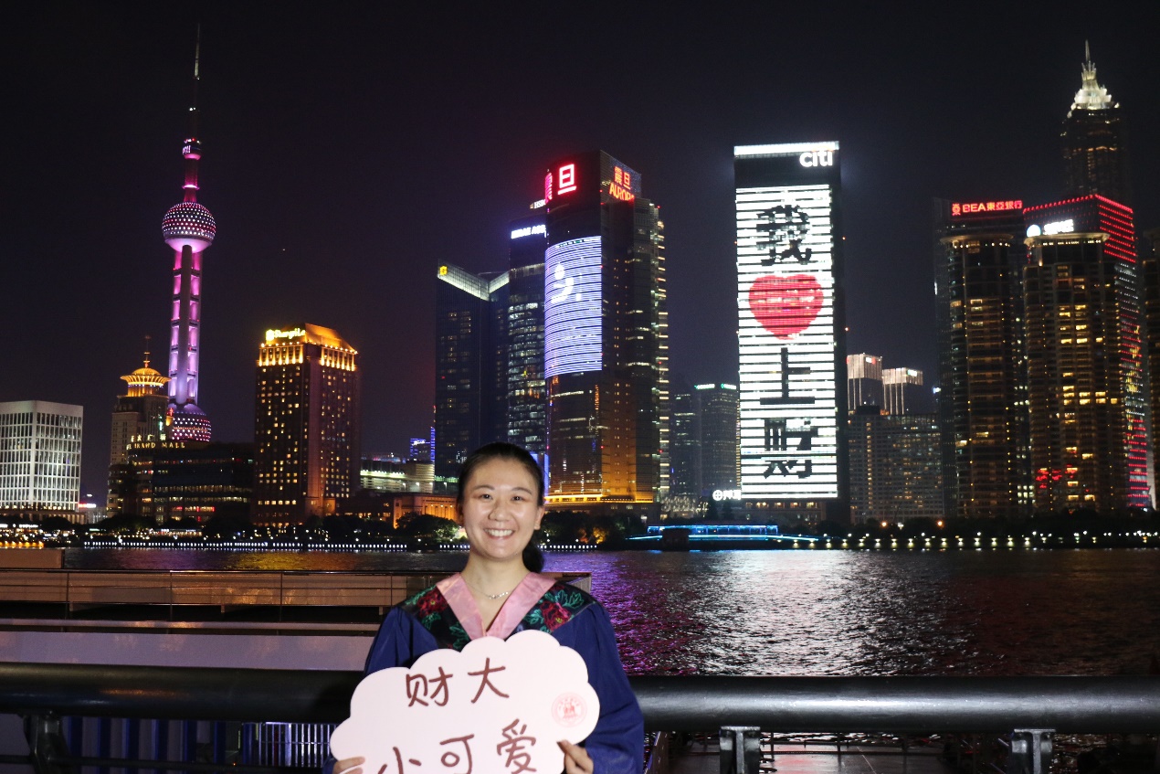 现场同学和周围群众纷纷用手机或单反记录下这一美好的时刻。工作人员提前准备的毕业服、校园吉祥物公仔、创意手持标签牌、DIY头灯等道具为这些毕业照更添了许多上财文化特色和合影趣味。黄浦江水波光粼粼,外滩之窗图案变换,上财学子笑意盈盈。