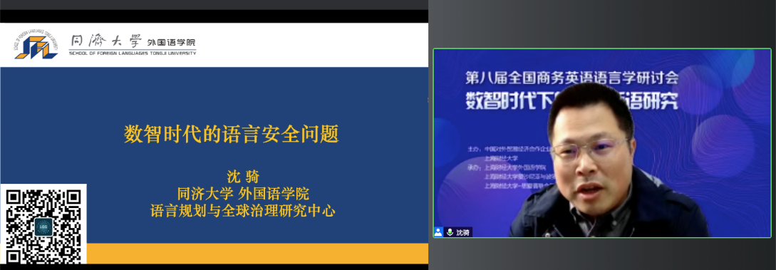 下午环节,同济大学沈骑教授首先做了一场“数智时代的语言安全问题”的学术报告。他提出数智时代的语言安全问题是总体国家安全能力建设中的关键命题之一,也是语言服务与语言治理的基本任务。沈教授基于语言安全理论,提出数据驱动的语言安全研究新框架、新方法与新路径,受到参会学者一致肯定。