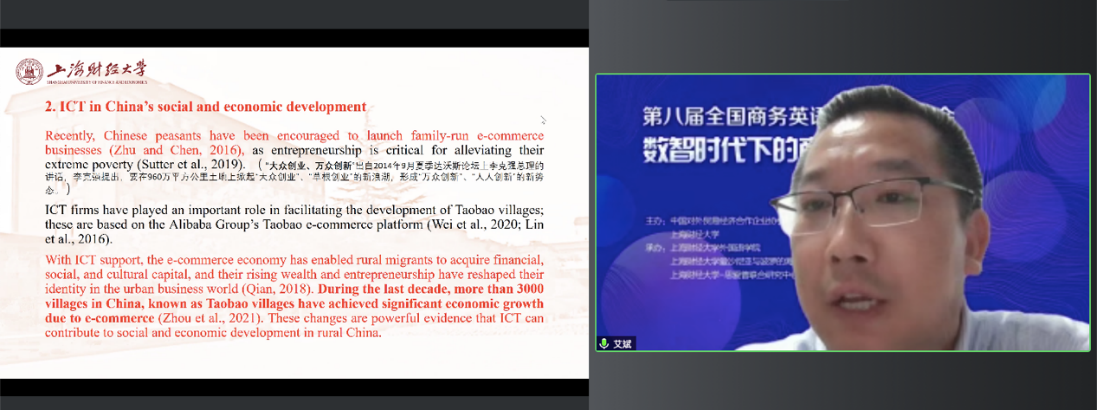 上海财经大学艾斌特任研究员以《农民数字素养与减贫发展民族志个案研究》为题做了一场具有人文关怀、“有温度”的学术报告,提出数智化时代农民数字素养是农民个人语言能力的组成部分,提升农民数字素养有助于促进农村信息交流,提升生产效率,构建新的数字化合作经营模式,并且还影响到农民形象、农民尊严和他们从“传统农民”到“农村专业人员”的身份转变,帮助他们融入数智时代。他呼吁更多商务语言学界语言服务专家关注乡村振兴国家战略,体现了商务英语学者的“匡时”精神。