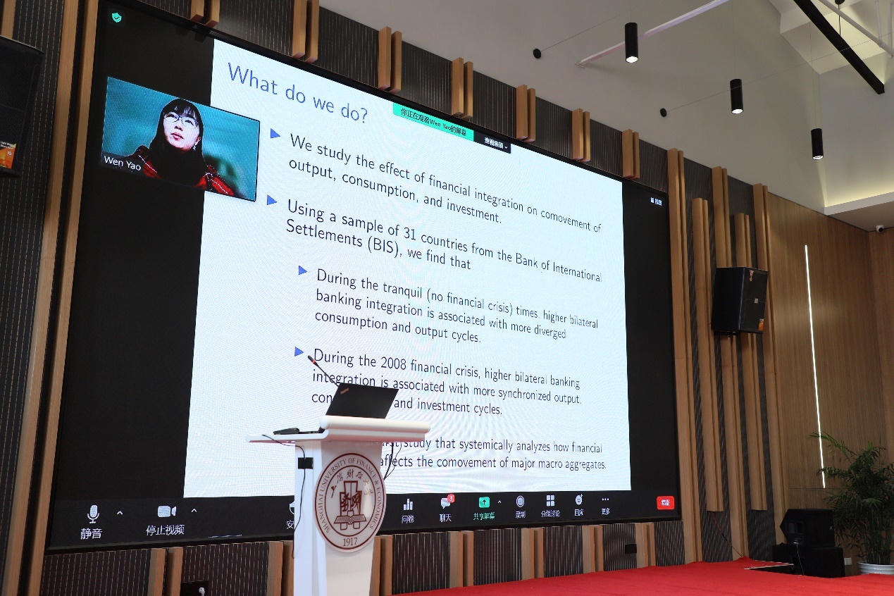 清华大学姚雯副教授演讲的主题是“The Effects of Financial Integration during Crisis”。文章首先通过实证检验了双边金融一体化程度的提升对两国经济周期同步性的影响。结果发现,在非金融危机时期,金融一体化程度越高,产出周期越趋于分化;而在经济危机时期,金融一体化程度越高,产出周期越趋于同步。金融一体化对于消费周期和投资周期也有类似的影响。接着,她介绍了一个两国DSGE理论模型,根据模型推导发现,危机对经济周期影响的传导取决于冲击的类型。生产率冲击下两国经济周期更趋于分化,信贷冲击下更趋于同步。华东理工大学陈美晨助理教授在点评中指出,非危机期间经济周期更趋于分化的背后原因有待补充,内生性、反向因果问题还需要更好地解决,以及可以研究特定时期或特定类型的国家是否会有不同的结果。