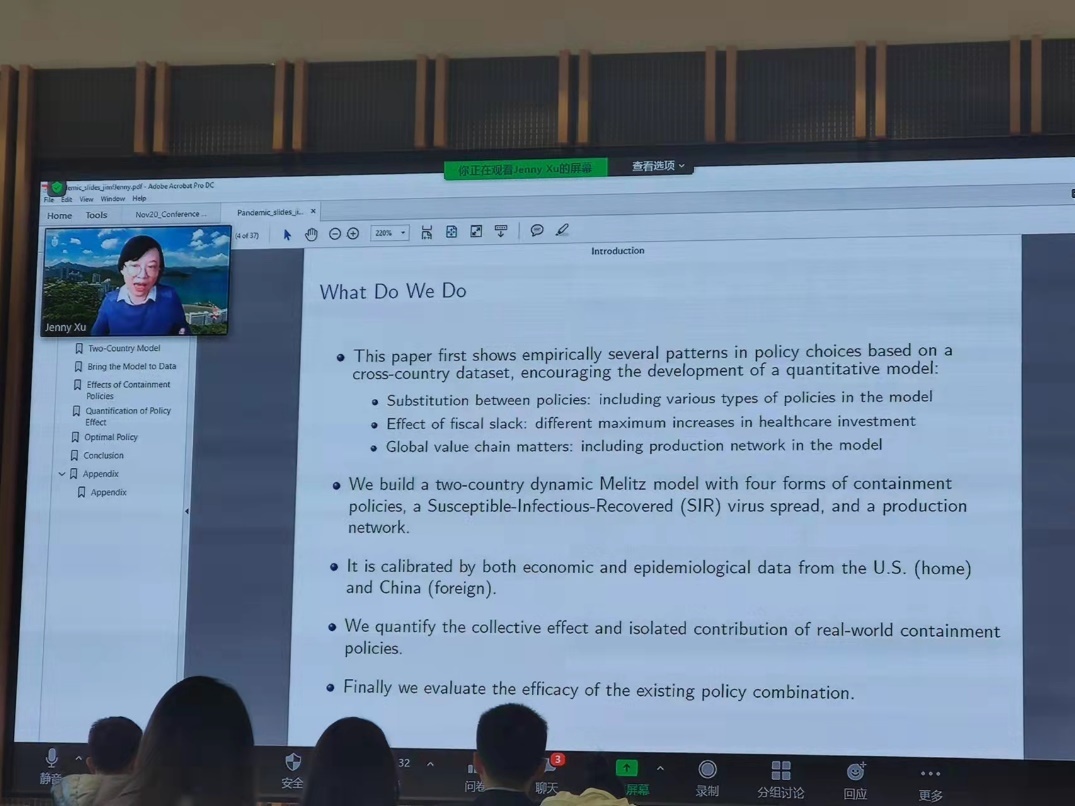 香港科技大学徐隽翊副教授演讲的主题是“Pandemic and Containment Policies in Open Economy”。她分析了在存在企业进入-退出行为、SIR病毒传播和生产网络的开放经济环境下,四种防控政策(关闭工作场所、限制社交距离、紧急医疗投资、限制跨境流动)的经济外部性和流行病学外部性。徐隽翊副教授等的研究基于各国使用不同防控政策的实证结果构造了理论模型,发现:关闭工作场所的政策是流行病管理中最有效的,而社交距离限制是一种以邻为壑的策略。她在演讲中提出,国家间政策合作使每个国家能够专门从事不同的政策,同时也能改善整体福利,现实世界的政策不同于合作和纳什均衡中的最优政策,但在“为最坏做准备”的情况下,它们非常接近于次优政策。来自复旦大学的助理教授邱实从中美疫情防控政策的不同、《CARES法案》和居家工作、检疫能力和医疗支出等三方面对该研究提出了相应的建议。