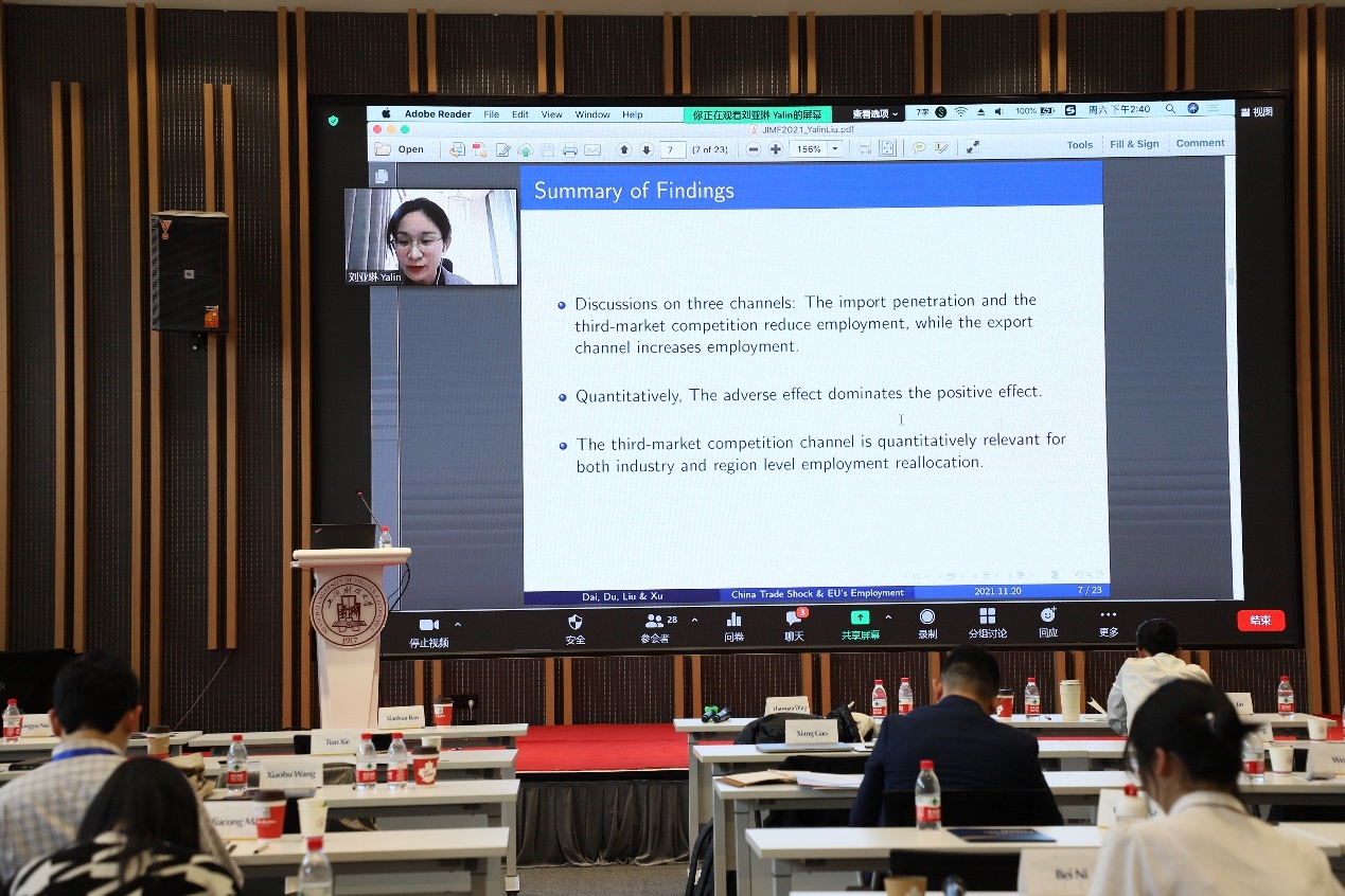 中央财经大学刘雅琳助理教授演讲的主题是“The China Trade Shock and the European Union’s Employment: The Role of Third-Market Competition”。作者将与中国进行贸易对本国劳动力市场的影响渠道分为三方面:来自于中国的进口渗透、直接出口到中国、在欧盟内部第三国与中国进行贸易市场竞争。来自于中国的进口渗透和在第三国与中国进行贸易市场竞争会对本国的相对就业增长情况带来不利影响,而出口中国则增加了本国的相对就业。而且,进口渗透和在第三国市场与中国开展竞争给就业带来的不利影响比出口给就业带来的积极影响要大。上海财经大学黄子彬助理教授点评时认为,在欧盟内部第三国与中国进行贸易市场竞争这个渠道探讨起来非常有意思,将贸易冲击的影响机制分解成三方面的有关模型还需要更细致地推导。
