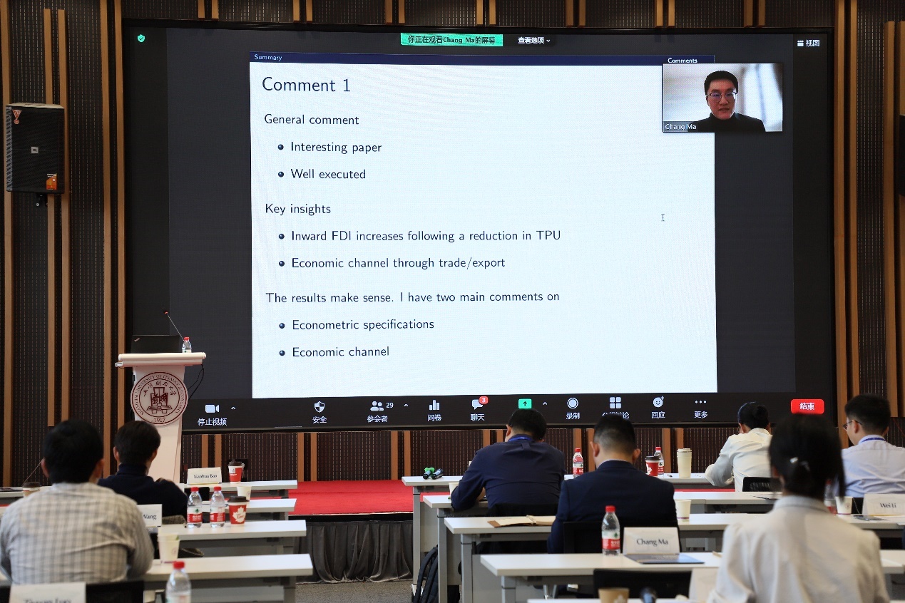 上海财经大学助理教授邓建鹏演讲的主题是“Trade Policy Uncertainty and Foreign Direct Investment: Evidence from China's WTO Accession”。他以中国加入世界贸易组织作为准自然实验,采用双重差分法考察了我国主要出口目的国(美国)市场的贸易政策不确定性(TPU)是否会影响流入中国的外商直接投资(FDI)。在演讲中,他提出,相对于面临美国TPU降幅较小的行业,我国TPU降幅较大行业的FDI流入增加得更多,剔除来源于美国的FDI之后结果仍然如此。邓建鹏助理教授认为,主要经济体的TPU削减对于增加全球外商直接投资流动和疫情中的经济复苏至关重要。来自复旦大学的马畅副教授认为这是一篇有趣的文章,但提出需要考虑时变的行业变量(如行业资本、技术密集度等)来改进计量模型设定,以及可以使用企业层面的数据进一步考察贸易政策不确定性降低影响外商直接投资的机制。
