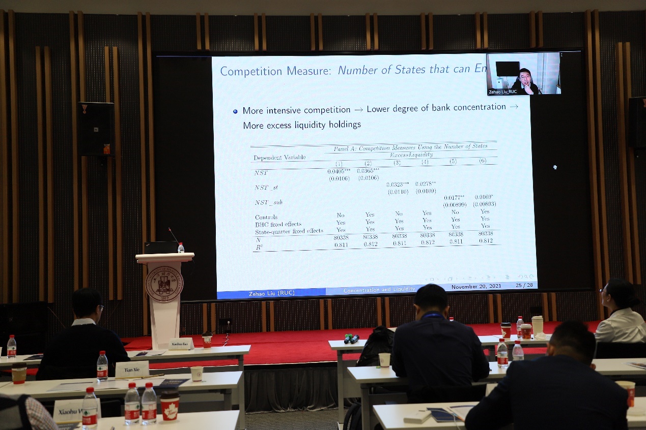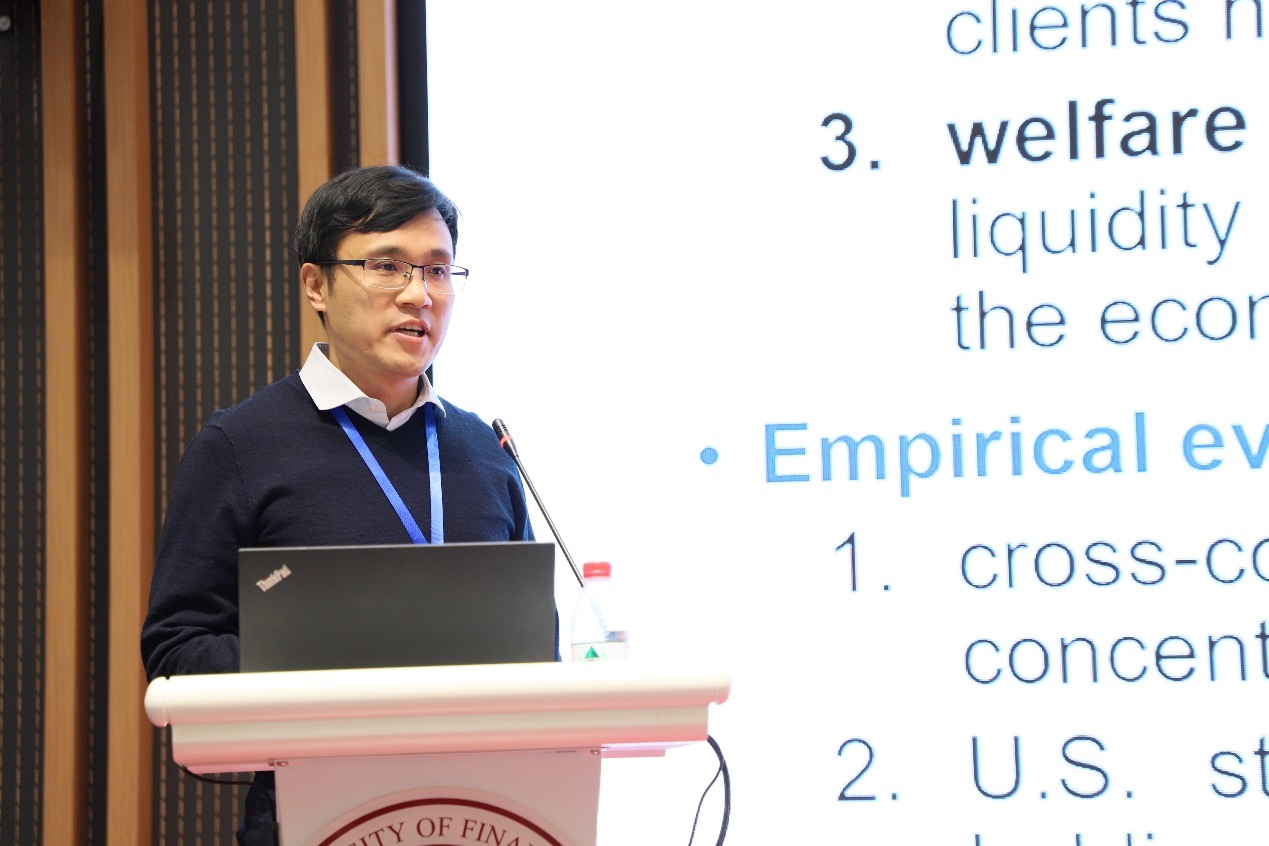 来自中国人民大学的刘泽豪副教授演讲的主题是“Bank Concentration, Payment System, and Liquidity”。文章构建了一个三期理论模型,并结合金融危机前多国银行业和20世纪末美国银行业放松洲际管制的事实进行实证分析,探讨银行集中度和银行必要流动性持有之间的关系。结果表明,银行业集中度越高,消费者越可能成为同一家银行的客户,在存款成为主要支付渠道后,银行可以不用履行实际支付,这降低了银行的支付义务,因此银行可以持有更低的流动性。上海财经大学聂光宇副教授对文章故事给予了肯定,并进一步提出,文章模型需要突出假设和参数,区分不同规模银行对流动性风险的反应,可以关注银行层面变化和其长期反应,以更好地验证因果关系。