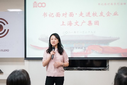 首先由文广集团副总裁钟璟校友致辞。钟璟校友首先对来自母校的老师、同学以及校友们的到来表示热烈欢迎,同时她也提到,通过本次活动把在文广集团各个重要岗位中的上财校友们集结到一起也是一次创举,加强了上财校友在工作中的凝聚力。她希望同学们能够通过本次企业走访活动能更加深刻、直观地了解上海文广集团各个部门的职能,帮助同学们在未来的职业规划中做出更适合自己的选择。