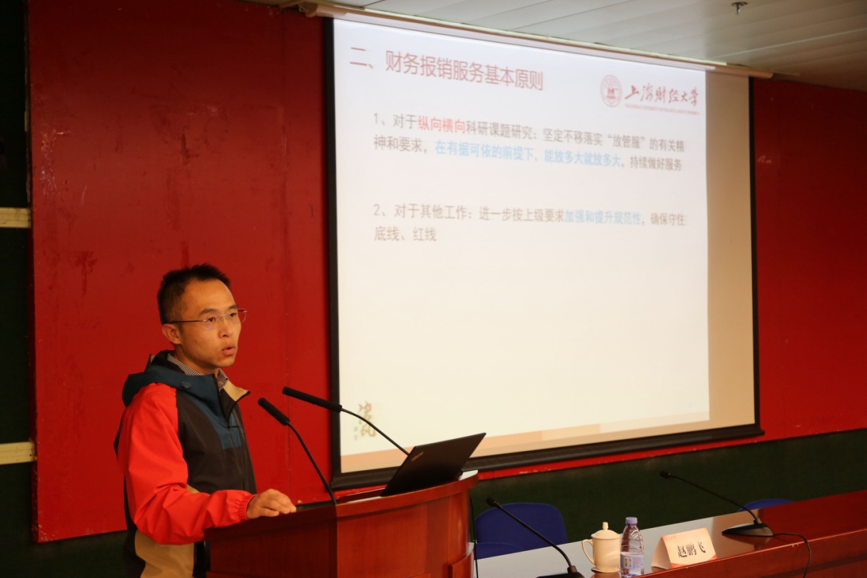 12月2日下午,针对学校“国内差旅费报销等校内制度重新制定修订情况”,上海财经大学财务处副处长赵鹏飞主要从“财务报销主要制度体系”“财务报销服务基本原则”“差旅费报销主要说明”和“科研‘放管服’”四方面作了提示和建议。对于财务专项工作,领导干部须按上级要求加强和提升规范性,确保守住底线、红线,从源头上确保严谨、规范。
