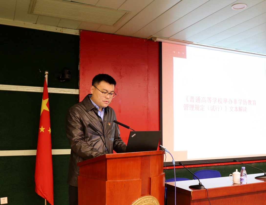 12月3日上午,上海财经大学党委校长办公室副主任、非学历教育办公室副主任王峰从“政策文本”“我校非学历教育管理概况”“国内部分典型高校调研情况”和“近期工作”四方面对“教育部《普通高等学校举办非学历教学管理规定(试行)》和学校非学历教育工作”进行解读。