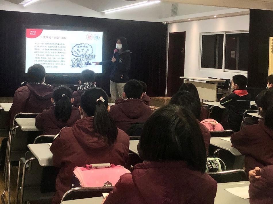 11月26日下午,上海财经大学法学会党支部和上财法学会、上财法学院学生会成员一同来到了上海市江浦街道社区学校进行普法宣传与红色法文化宣讲活动。宣讲志愿者陈静用生动贴切的比喻,将宪法喻为“法律妈妈”“参天大树的重要枝干”来帮助小朋友们更好地理解宪法在我国法律体系中的地位,以“乐团的指挥”“蛋糕的分配者”形象地解释了宪法划分国家机关职责、维护人民合法权益、保障人民当家作主的作用。紧接着,宣讲志愿者张杰对本次宪法宣讲活动进一步升华,让小朋友们更深刻地明了此次普法活动的目的,即明白国家对小朋友们的殷切期待,以激励他们争做德智体美劳全面发展的好孩子,在未来祖国的发展建设贡献出自己的力量。