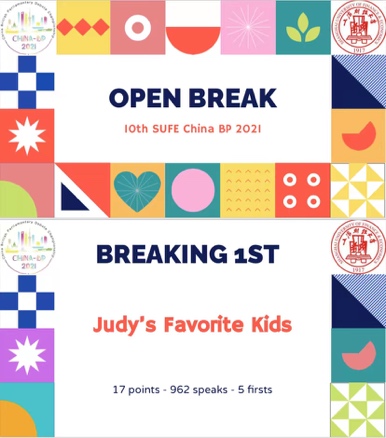 特邀裁判则分别是来自亚、欧、美、澳、非等14个国家的国际裁判。本届参赛总规模超过300人,同时在三个Zoom会议室平台进行,通过Zoom、Tabbycat、Facebook和微信等四大线上平台同步传送比赛各项信息,成为“中国BP辩论赛”历史上最难晋级的一届赛事。