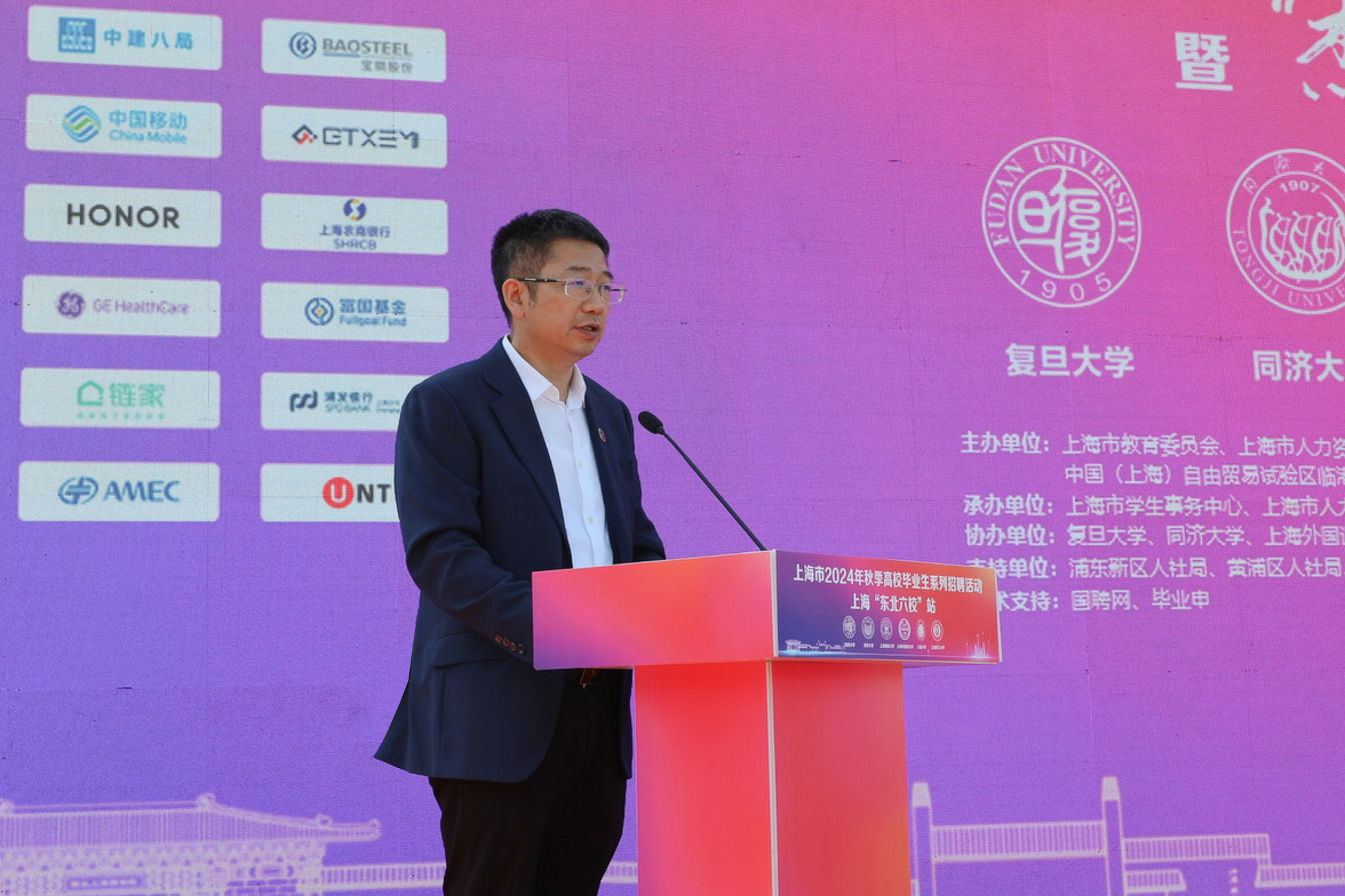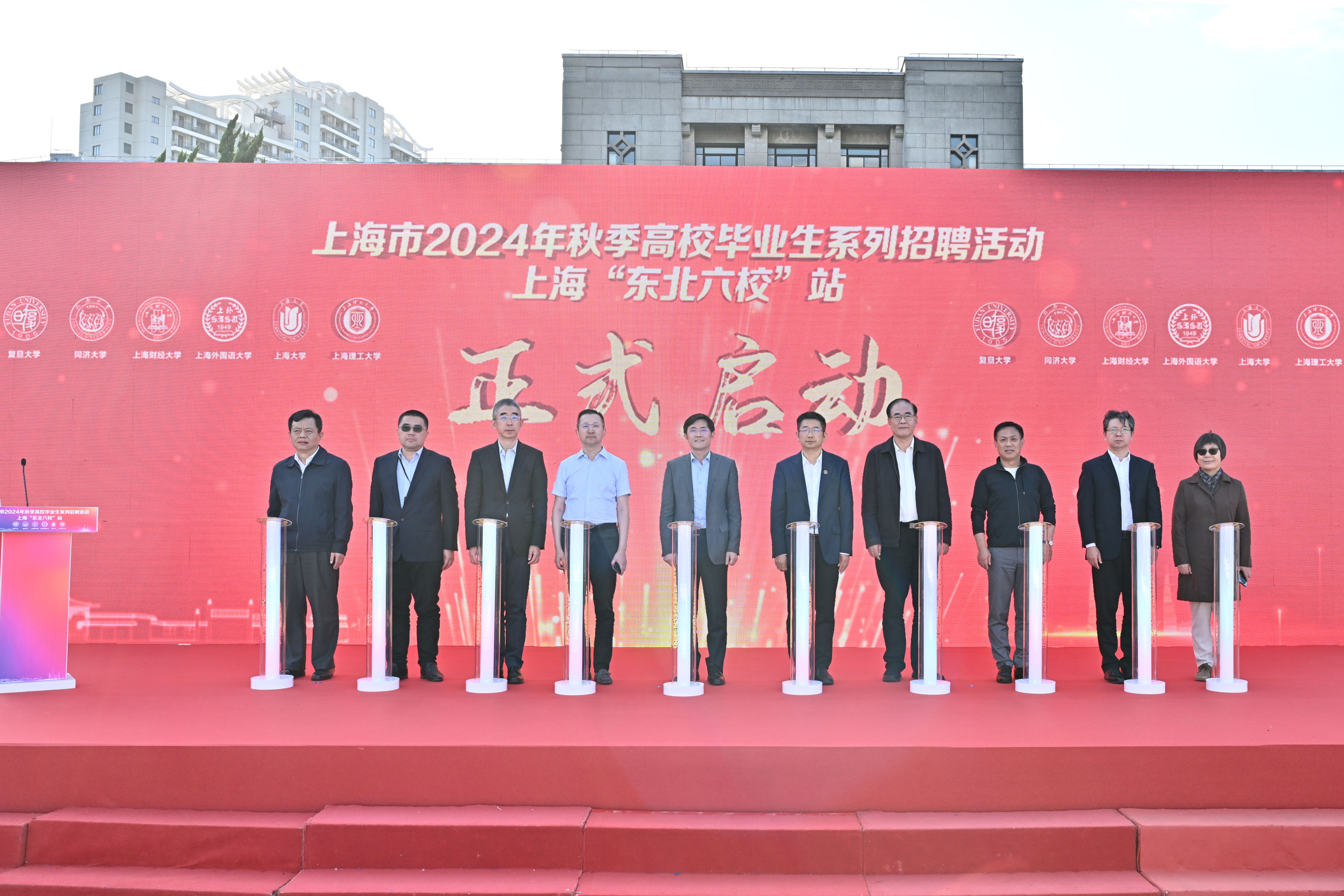 上海财经大学党委书记许涛,上海市教委副主任王浩,上海市总工会副主席徐珲,杨浦区人民政府副区长王浩,上海市教委学生处处长丁良,上海市学生事务中心党总支书记、主任赵猛,上海市人力资源公共服务中心主任丁峰,上海市金融发展服务中心主任朱培隽,上海市总工会职工服务中心主任陈鲁,上海市杨浦人社局局长朱萍出席并宣布上海市2024年秋季高校系列招聘“东北六校”站启动,上海市“东北片区”六校与“西南片区”五校就业部门负责人等出席启动仪式。