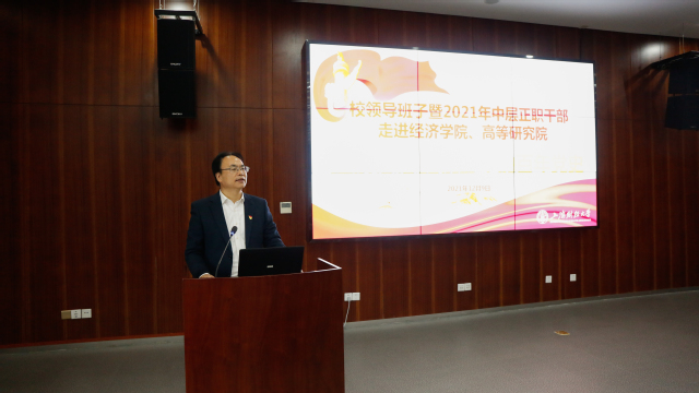 为学校领导干部、教师更好更全面地理解十九届六中全会的重要精神,12月9日上午,学校组织校领导班子成员暨2021年中层正职干部走进经济学院、高等研究院开展“经济思想史视野中的百年党史”专题学习活动。校常务副校长徐飞,副校长陈信元,党委副书记朱鸣雄,党委常委、党委组织部部长刘庆生,党委常委、党委统战部部长周杰普,中层正职干部和经济学院、高等研究院、中国经济思想发展研究院教师代表出席并参加了本场专题学习,活动由经济学院党委书记王昉主持。